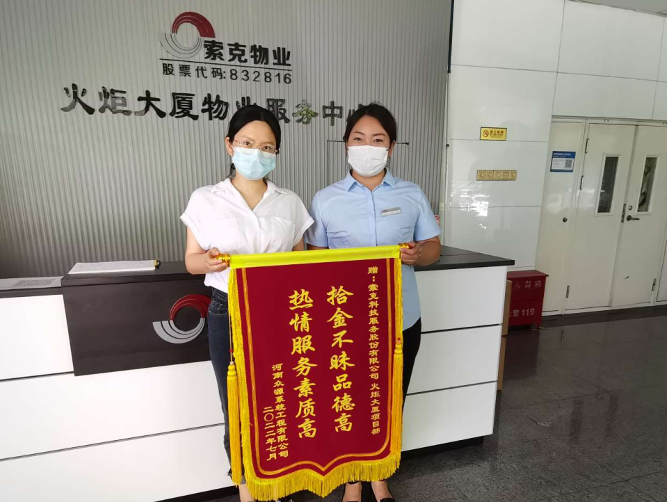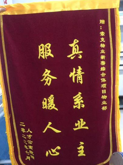 2022年7月,索克新密创新创业综合体人才公寓项目业主代表为感谢索克提供细致入微的服务,帮助业主及时解决问题,特地将印有“真情系业主、服务暖人心”的锦旗送到物业服务中心。