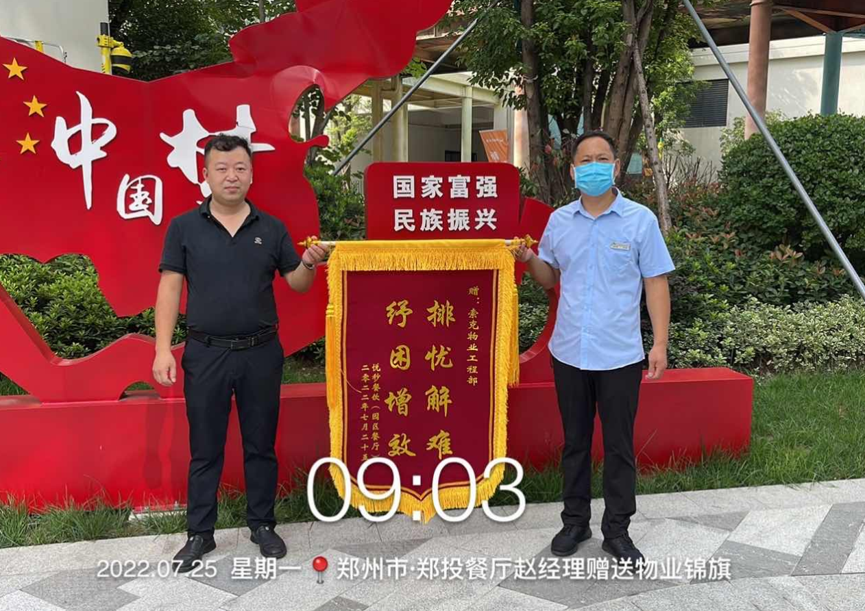 7月25日9:00,索克郑投科技园餐厅负责人赵先生一大早来到物业服务中心,手捧锦旗连连称赞物业工程部刘卫建师傅,感谢刘工放弃休假,为餐厅检查维修供电线路。原来在7月23日上午,索克郑投科技园餐厅供电临时出现问题,原有的餐厅工程团队已撤场,为了保障园区300多学生的正常用餐,赵先生尝试联系物业维修,工程部刘卫建在得知这一消息后,主动放弃休假,骑摩托车从郑州西四环行驶40分钟来到位于南四环的郑投科技园,为餐厅检查维修供电线路,帮助业主租户排忧解难,避免不小的经营损失。